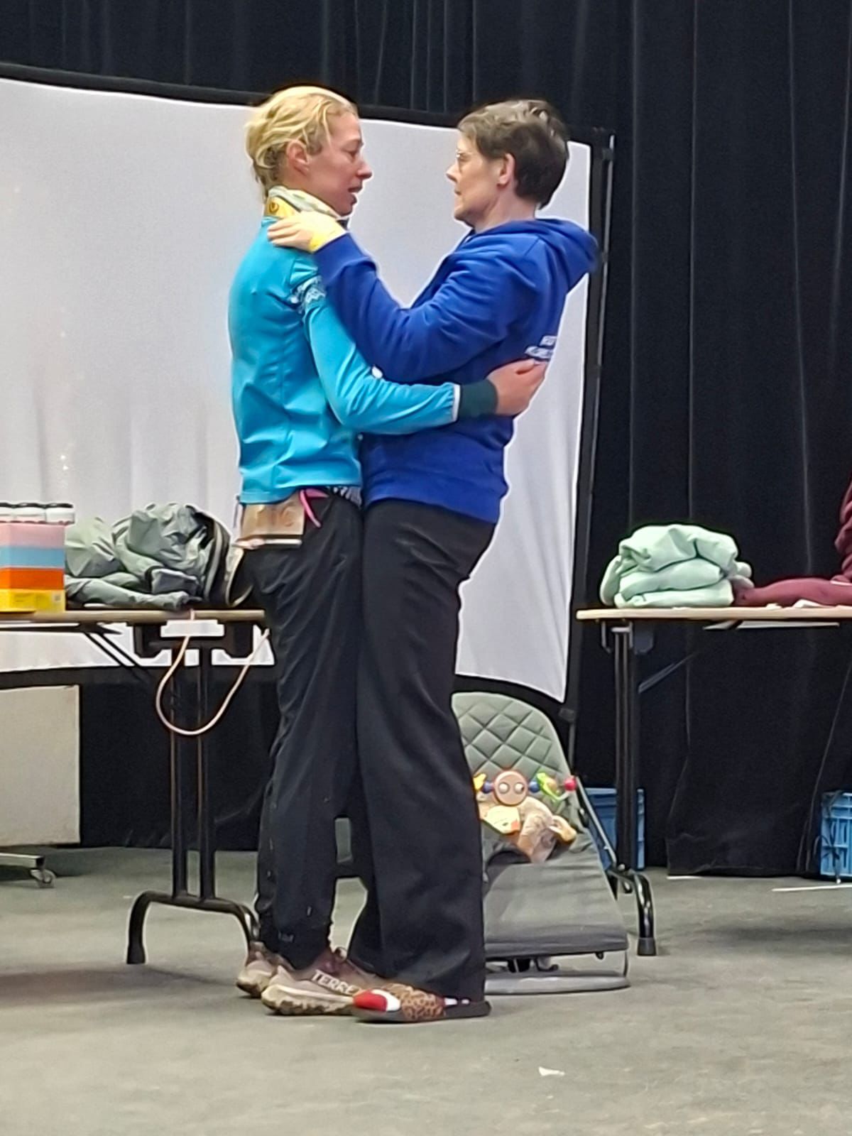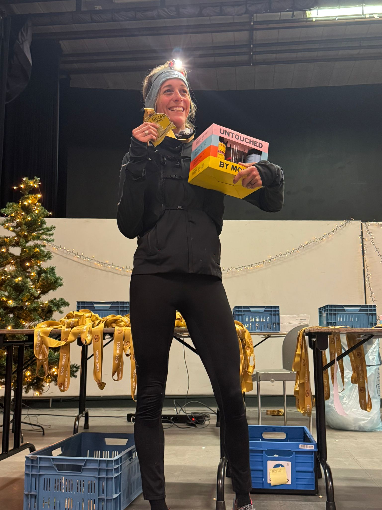 Na 150 sterke kilometers, moest ook Jelle de strijd staken en was het lichaam plots leeg, het hoofd ook. Soms is stoppen geen verlies, maar gewoon luisteren. Geen schande als we zien hoe Jelle het voorbije jaar gegroeid is. Daar gaan we nog grote dingen van zien. Niet veel later, na de tweede passage in Pecrot rond 155 kilometer, sloeg het noodlot toe bij Griet. Tot dan had ze glimlachend zij aan zij met Carine gelopen, maar plots was het vat leeg. Flauwgevallen, volledig leeggestreden. Dankzij de snelle en warme zorgen van Carine, enkele medelopers en de EHBO kwam alles gelukkig snel weer goed. Later zouden Carine en Griet elkaar terugzien op het podium, een beeld van pure emotie, gedeelde kilometers en vriendschap, eentje dat meer zegt dan duizend woorden.