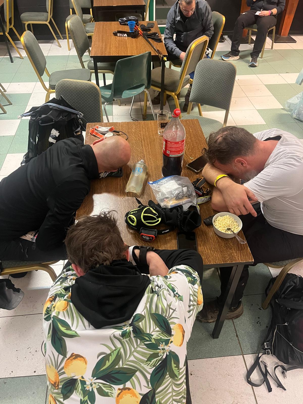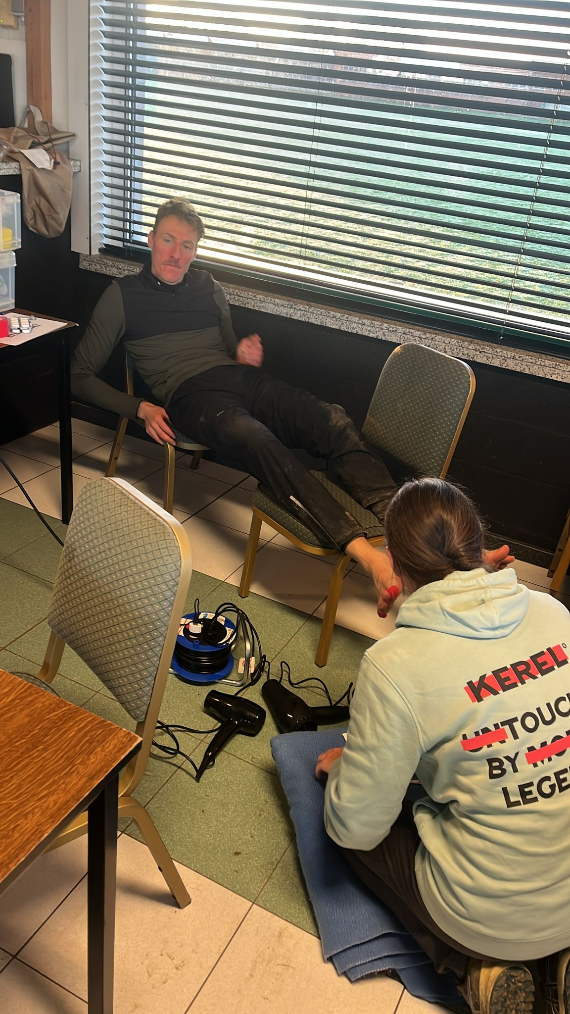 'Hij die niet genoemd wil worden' voelde al vroeg dat het niet zijn weekend zou worden. Geen goesting, geen benen. Soms weet je dat gewoon. In CP2 maakte hij de verstandige keuze om te stoppen. Maar wie dacht dat 'Kris' dan gewoon in de zetel ging kruipen, kent hem niet. Na zijn DNF ontpopte Kris zich tot een onmisbare schakel aan de controleposten. Hij hielp, motiveerde, gaf eerlijke feedback en stond klaar met raad en een luisterend oor voor wie het nodig had. Voor velen werd hij dat weekend geen loper, maar een anker. Iemand die je blik terug scherp stelde wanneer het hoofd begon te zweven. Dat is TBK: ook als je zelf stopt, blijf je er staan voor de rest. Robin startte met een blessure en probeerde erdoor te lopen, maar na CP3 was het duidelijk dat verder doen geen verstandige optie was. Nog 140 kilometer negeren wat je lichaam schreeuwt, zou niet slim zijn. De moed om te stoppen is soms groter dan de drang om door te gaan. Gezondheid primeert, altijd.